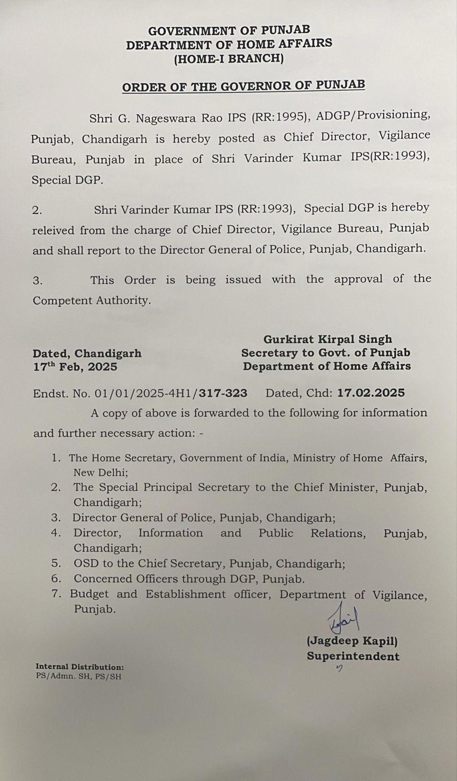 ਚੰਡੀਗੜ੍ਹ : ਇਸ ਸਮੇਂ ਸਭ ਤੋਂ ਵੱਡੀ ਖਬਰ ਸਾਹਮਣੇ ਆ ਰਹੀ ਹੈ ਕਿ ਪੰਜਾਬ ਸਰਕਾਰ ਨੇ ਵਿਜੀਲੈਂਸ ਮੁਖੀ ਖਿਲਾਫ ਵੱਡੀ ਕਾਰਵਾਈ ਕੀਤੀ ਹੈ। ਸਰਕਾਰ ਨੇ ਵਿਜੀਲੈਂਸ ਮੁਖੀ ਵਰਿੰਦਰ ਕੁਮਾਰ ਨੂੰ ਅਹੁਦੇ ਤੋਂ ਹਟਾ ਦਿੱਤਾ ਹੈ।ਉਨ੍ਹਾਂ ਦੀ ਥਾਂ ‘ਤੇ ਪੰਜਾਬ ਵਿਜੀਲੈਂਸ ਦੇ ਨਵੇਂ ਮੁਖੀ ਨਾਗੇਸ਼ਵਰ ਰਾਓ ਨੂੰ ਜ਼ਿੰਮੇਵਾਰੀ ਸੌਂਪੀ ਗਈ ਹੈ। ਤੁਹਾਨੂੰ ਦੱਸ ਦੇਈਏ ਕਿ ਨਾਗੇਸ਼ਵਰ ਰਾਓ 1995 ਬੈਚ ਦੇ ਆਈਪੀਐਸ ਅਧਿਕਾਰੀ ਹਨ। ਅਧਿਕਾਰੀ ਸਨ। ਪੰਜਾਬ ਵਿਜੀਲੈਂਸ ਦੇ ਮੁਖੀ ਵਰਿੰਦਰ ਕੁਮਾਰ ਨੂੰ ਕਿਉਂ ਹਟਾਇਆ ਗਿਆ ਹੈ, ਇਸ ਬਾਰੇ ਕੋਈ ਸਪੱਸ਼ਟਤਾ ਨਹੀਂ ਹੈ।