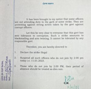 ਲੁਧਿਆਣਾ : ਲੁਧਿਆਣਾ ਦੇ RTA ਨਰਿੰਦਰ ਧਾਲੀਵਾਲ ਦੀ ਗ੍ਰਿਫਤਾਰੀ ਖਿਲਾਫ ਸੂਬੇ ਦੇ PCS ਅਧਿਕਾਰੀ ਸਾਮੂਹਿਕ ਛੁੱਟੀ ‘ਤੇ ਚਲੇ ਗਏ ਹਨ। ਕਈ ਜ਼ਿਲ੍ਹਿਆਂ ਦੇ ਦਫਤਰਾਂ ਵਿੱਚ ਕੰਮਕਾਜ ਪੂਰੀ ਤਰ੍ਹਾਂ ਠੱਪ ਹੈ। ਇਸੇ ਵਿਚਾਲੇ ਮੁੱਖ ਮੰਤਰੀ ਭਗਵੰਤ ਮਾਨ ਨੇ ਚਿਤਾਵਨੀ ਦਿੰਦਿਆਂ ਵੱਡਾ ਹੁਕਮ ਜਾਰੀ ਕਰ ਦਿੱਤਾ ਹੈ। ਮੁੱਖ ਮੰਤਰੀ ਭਗਵੰਤ ਮਾਨ ਨੇ PCS ਅਧਿਕਾਰੀਆਂ ਨੂੰ ਸਖ਼ਤ ਹਦਾਇਤਾਂ ਜਾਰੀ ਕੀਤੀਆਂ ਹਨ। ਸੀ.ਐੱਮ. ਮਾਨ ਨੇ ਪੀਸੀਐਸ ਅਧਿਕਾਰੀਆਂ ਨੂੰ ਹੜਤਾਲ ਖਤਮ ਕਰਕੇ ਦੁਪਹਿਰ 2 ਵਜੇ ਤੱਕ ਡਿਊਟੀ ਜੁਆਇਨ ਕਰਨ ਦੇ ਹੁਕਮ ਦਿੱਤੇ ਹਨ।